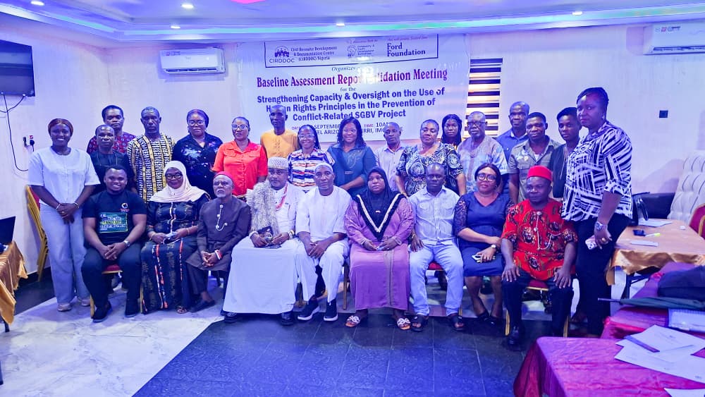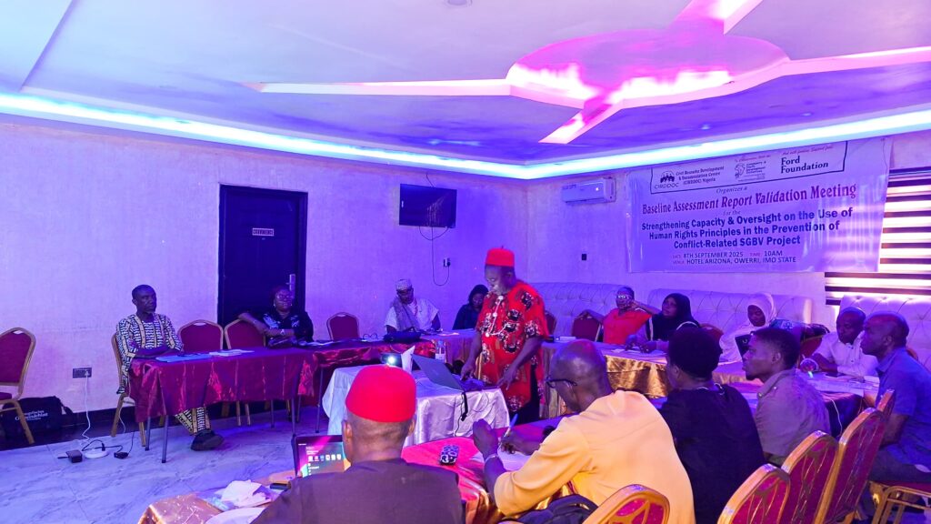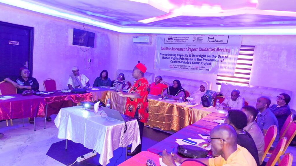 Community & Youth Development Initiatives (CYDI), in partnership with the Civil Resource Documentation and Development Centre (CIRDDOC) and with support from the Ford Foundation, recently hosted a Baseline Research Validation Meeting on the prevention of conflict-related Sexual and Gender-Based Violence (SGBV) in Imo State. Held on September 8, 2025, at Hotel Arizona, New Owerri, the one-day session brought together government officials, civil society actors, media practitioners, community leaders, and key Ministries, Departments and Agencies. The meeting aimed to validate findings from a baseline research conducted in three conflict-affected communities—Umuokanne (Ohaji-Egbema LGA), Orogwe (Owerri West LGA), and Okigwe Urban (Okigwe LGA)—and to co-create grassroots-led solutions grounded in human rights principles.